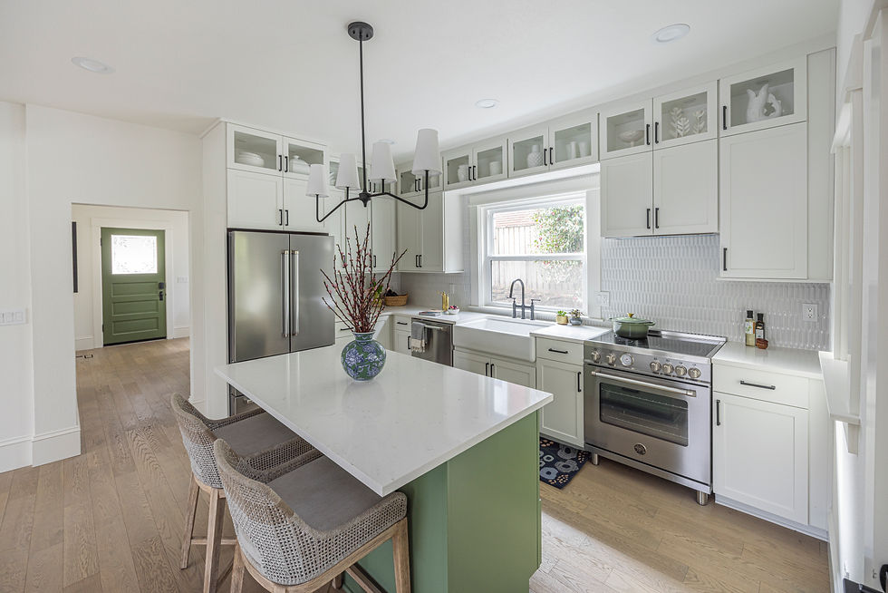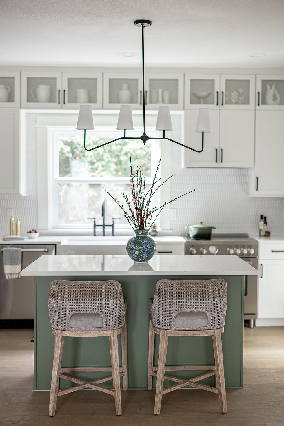 This kitchen remodel was part of a whole home renovation. The color palette and finishes were selected as part of a cohesive look for the home, touching on leafy greens to tie into the lush landscape outside, and whites and wood tones to freshen up the feel. Black metal tones were the perfect fit to keep the home casual and add a dark element to the newly lightened and airy space.
